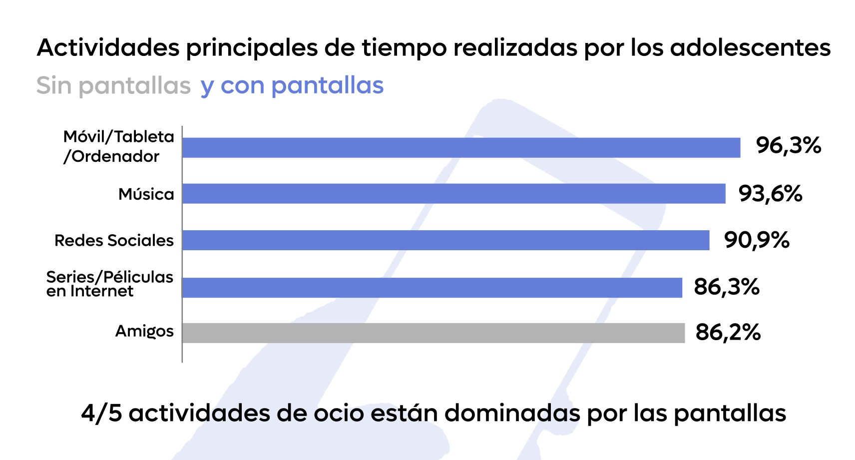 El 34,9% de los adolescentes pasan más de 5 horas diarias frente a las pantallas, que sube al 53,9% durante los fines de semana, valores que llegan al punto de ser considerados de adicción o de indicios de adicción.
